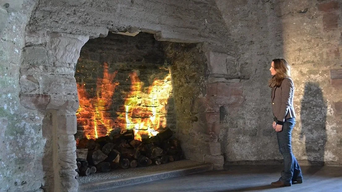 An old fireplace in the Chapel Tower of Conwy Castle is brought to life with the projection of flames revealing insights into past medieval life. Commissioned by Cadw and developed in collaboration with local re-enactment groups.