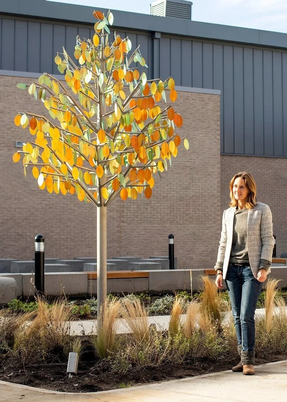 Wind responsive sculpture at Rowan View Hospital, Merseyside. Iridescent leaves shift between green, orange and gold tones, shimmering in the sunlight and reacting to the breeze, to create a calming garden feature for patients and staff.
